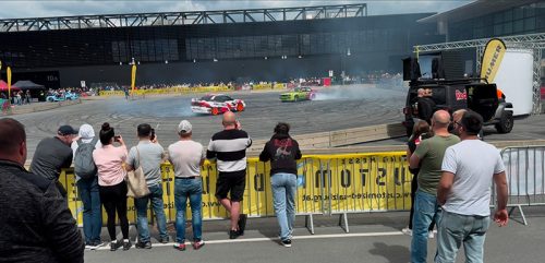 Divertente quanto rumoroso contorno delle immancabili esibizioni acrobatiche all’aperto di auto preparate, in un’affascinante miscela di musica e motori